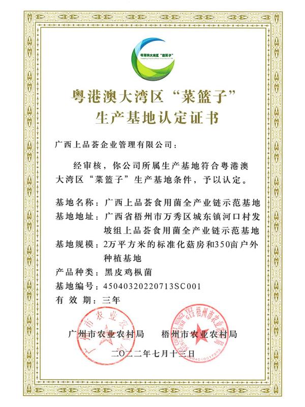 粵港澳區(qū)“菜籃子”生產(chǎn)基地認(rèn)定證書(shū)